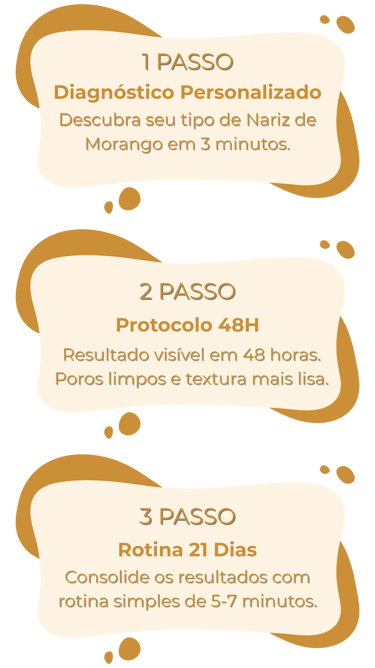 Rotina específica para o seu tipo de nariz que entrega resultado visível em apenas 48 horas: desobstrução inicial dos poros, controle de oleosidade sem rebote, redução visível da textura e aparência de poros menores. Essa microvitória te dá confiança para continuar até o dia 14.